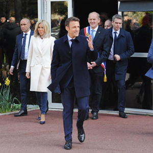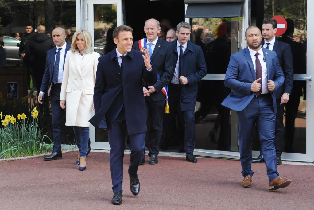 4月10日,在法國北部的勒圖凱-巴黎普拉日,法國總統馬克龍(前中)和夫人布里吉特(左二)在投票后走出投票站。(新華社發(fā),杰尼·威廉攝)