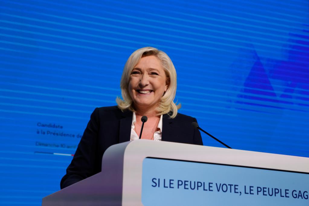 4月10日,法國極右翼政黨“國民聯(lián)盟”候選人瑪麗娜·勒龐在巴黎參加總統選舉首輪投票后的集會(huì )。(新華社發(fā),里特·艾斯攝)