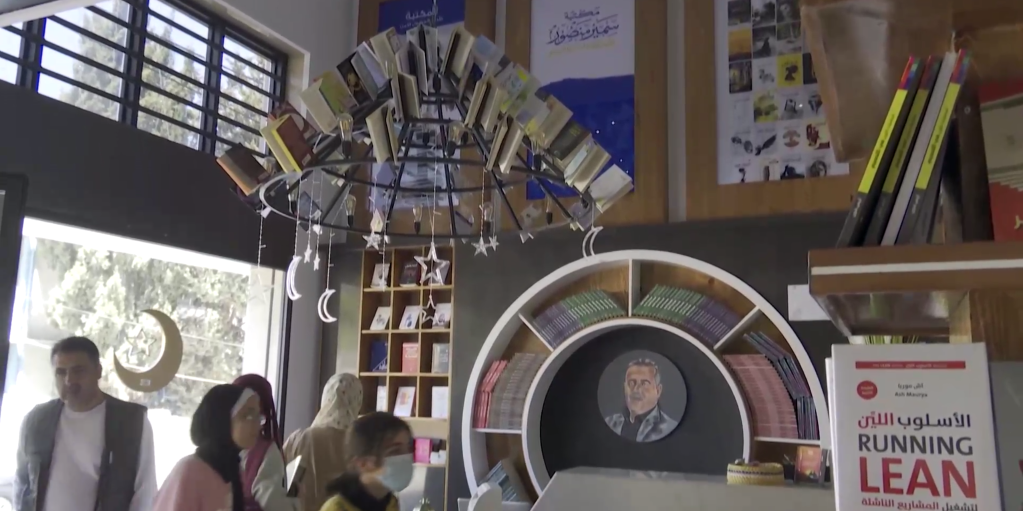 2022年2月重建開(kāi)業(yè)的薩米爾·曼蘇爾書(shū)店。(視頻截圖)