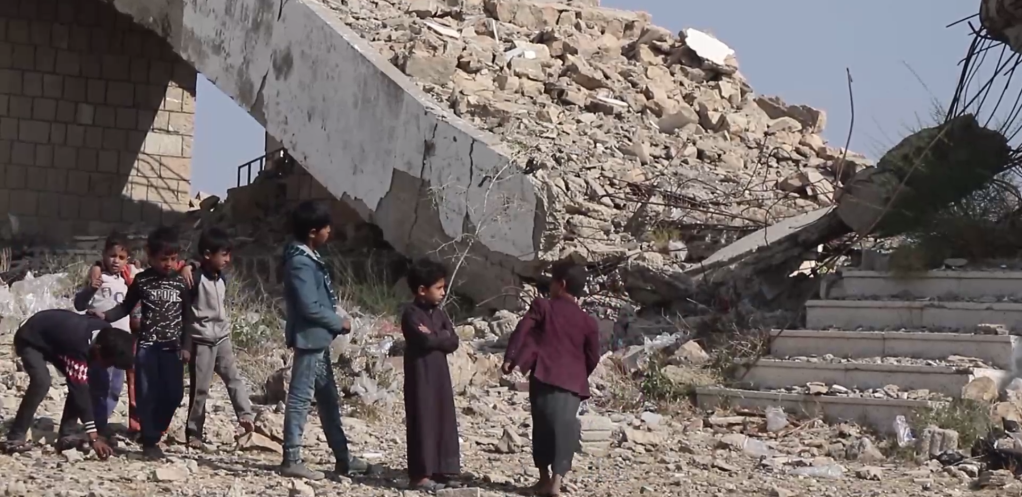 舒哈達-瓦赫達學(xué)校的學(xué)生們在廢墟中玩耍。(視頻截圖)