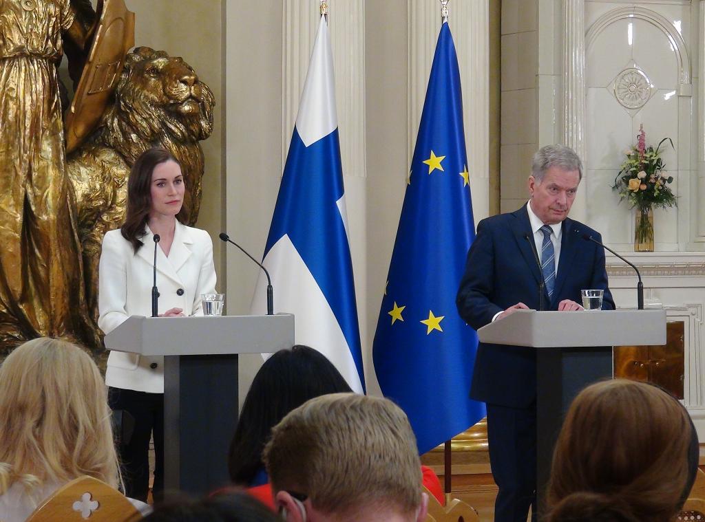 5月15日,在芬蘭赫爾辛基,芬蘭總統尼尼斯托(右)和總理馬林參加聯(lián)合記者會(huì )。新華社記者陳靜攝