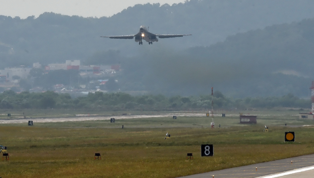 2016年9月21日,美軍B-1B轟炸機準備在美軍駐韓國烏山空軍基地著(zhù)陸。新華社/紐西斯通訊社