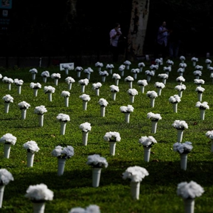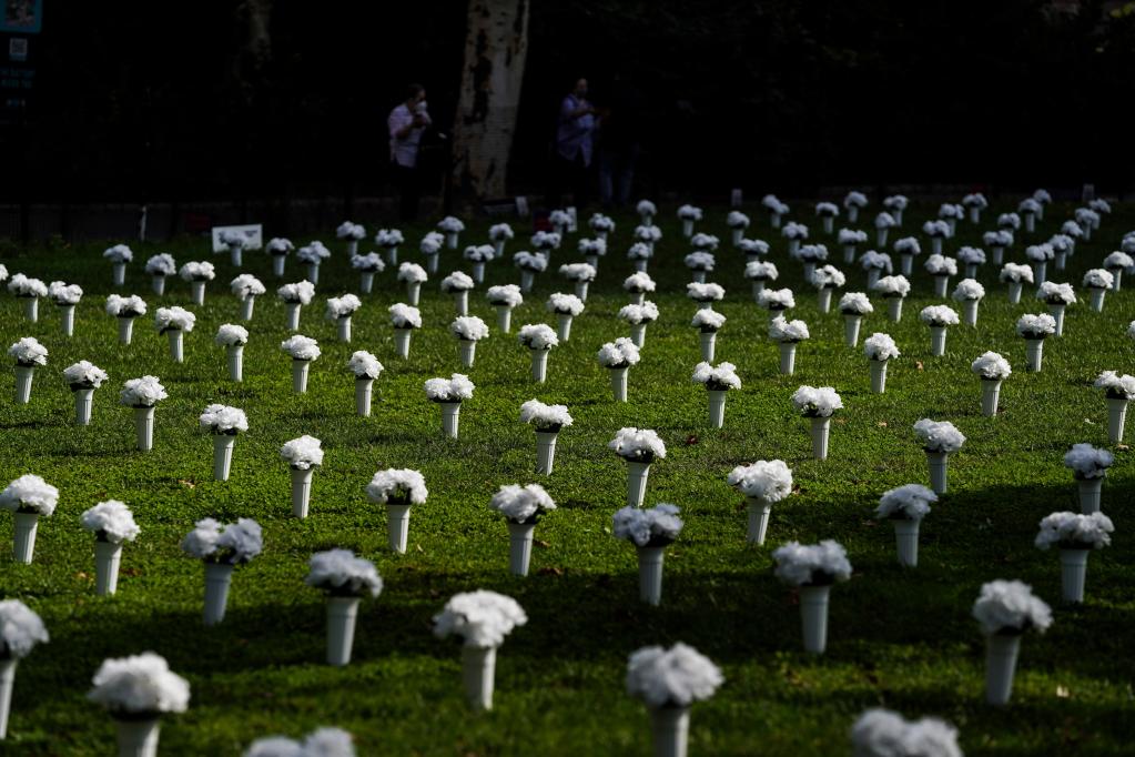 這是2021年10月8日在美國紐約炮臺公園內拍攝的為悼念槍支暴力遇難者擺放的白色瓶花。(新華社記者王迎攝)