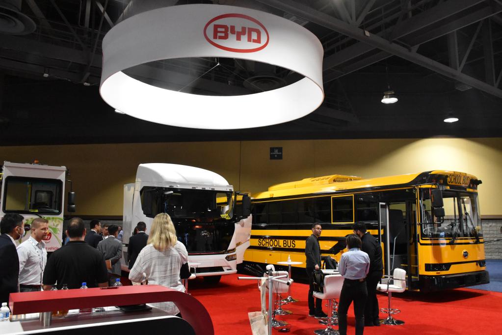 5月10日,人們在美國加利福尼亞州長(cháng)灘市舉行的2022年先進(jìn)清潔運輸博覽會(huì )上參觀(guān)比亞迪展區。(新華社發(fā),曾慧攝)