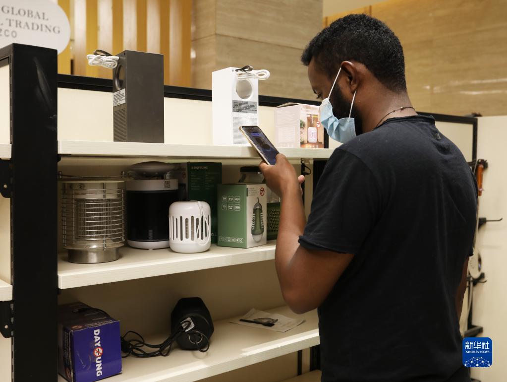 9月14日,在吉布提國際自貿區,一名非洲創(chuàng )業(yè)青年用手機查看跨境電商平臺商品。
