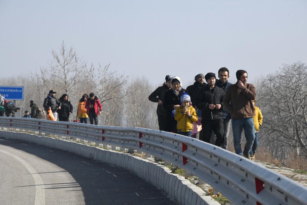 2020年3月1日,在土耳其埃迪爾內省,難民和非法移民步行前往土耳其與希臘邊境。新華社記者徐速繪攝