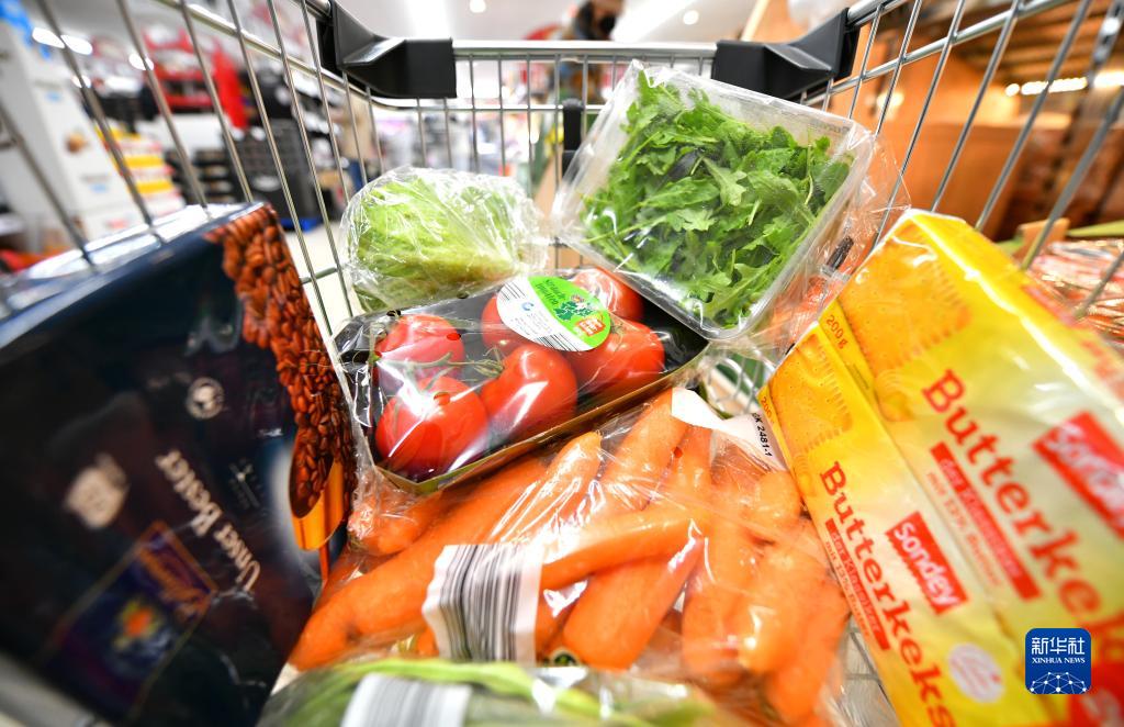 這是11月11日在德國柏林一家超市內拍攝的購物車(chē)內的商品。