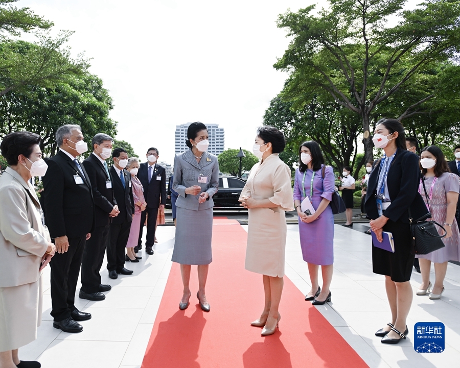 當地時(shí)間11月19日上午,國家主席習近平夫人彭麗媛在泰國總理夫人娜拉蓬陪同下參觀(guān)甘拉雅尼音樂(lè )學(xué)院。這是彭麗媛抵達時(shí),娜拉蓬等熱情迎接。新華社記者 謝環(huán)馳 攝