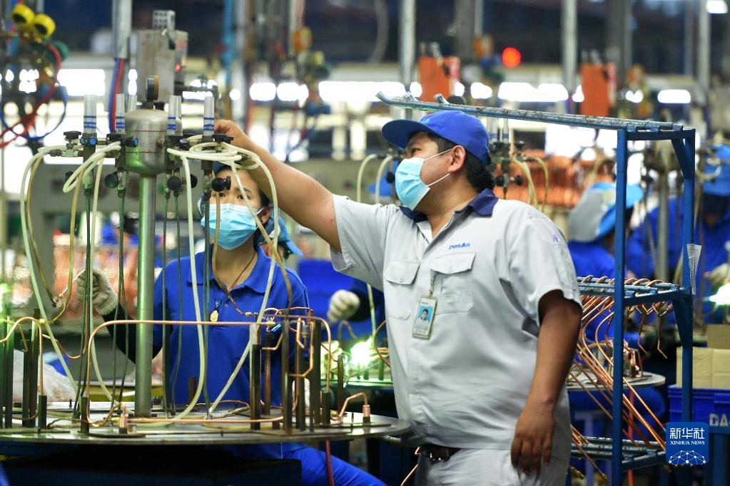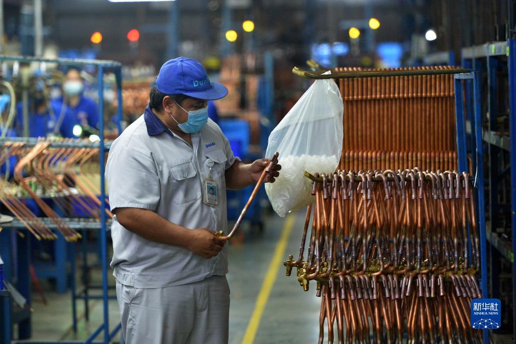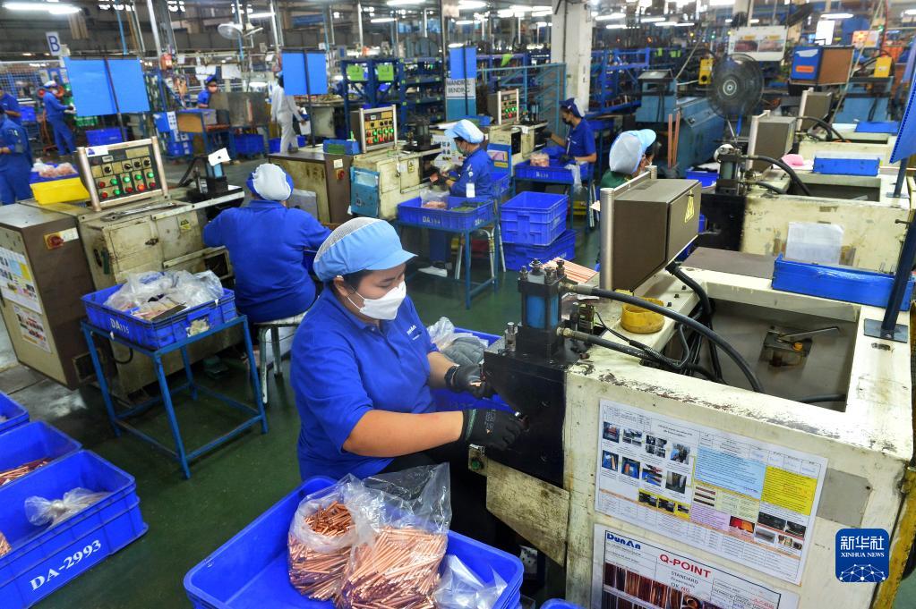 11月8日,在位于泰國羅勇府的泰中羅勇工業(yè)園,工人在盾安金屬(泰國)有限公司生產(chǎn)線(xiàn)上工作。新華社發(fā)(拉亨攝)