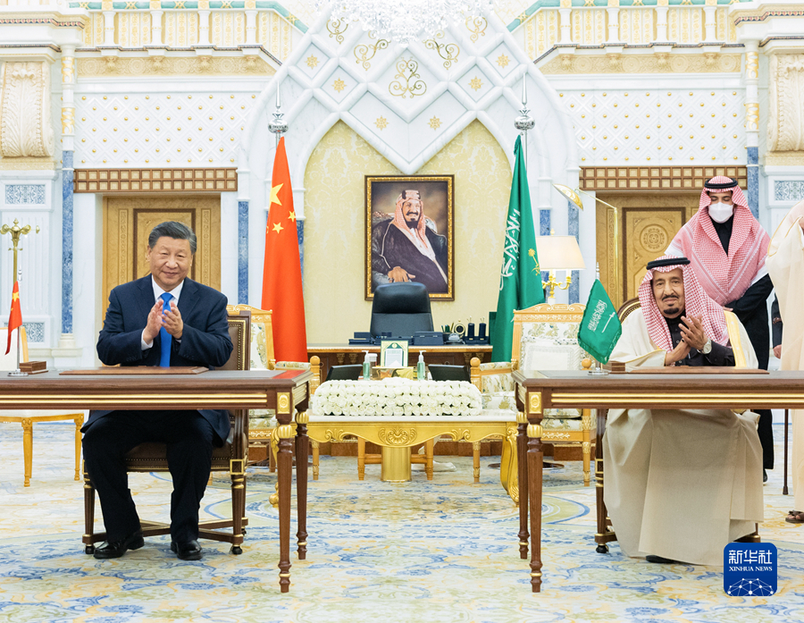 當地時(shí)間12月8日下午,國家主席習近平在利雅得王宮會(huì )見(jiàn)沙特國王薩勒曼。這是兩國元首親自簽署《中華人民共和國和沙特阿拉伯王國全面戰略伙伴關(guān)系協(xié)議》,同意每?jì)赡暝趦蓢喠髋e行一次元首會(huì )晤。新華社記者 黃敬文 攝