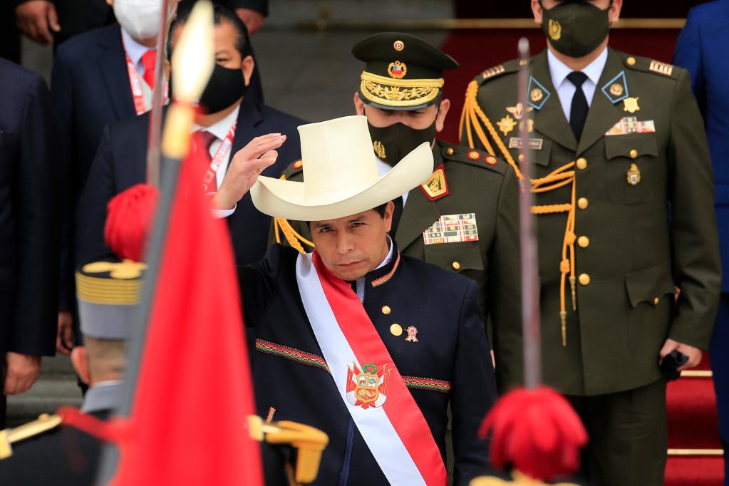 2021年7月28日,在秘魯首都利馬,卡斯蒂略在宣誓就職后檢閱儀仗隊。新華社發(fā)(瑪利亞娜·巴索攝)
