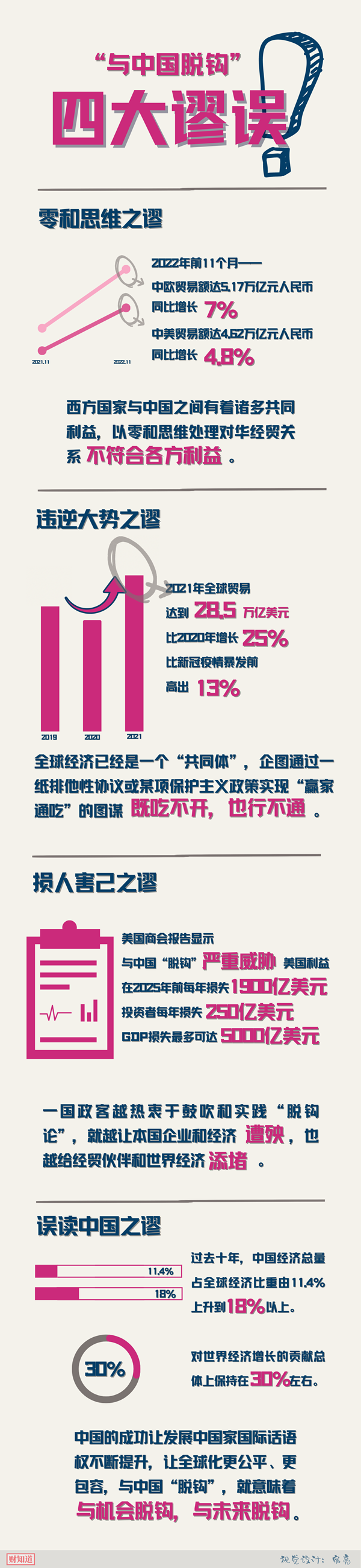 鼓吹“脫鉤論”,根源在于一些人的零和思維。他們無(wú)法容忍非西方發(fā)展模式取得成功,將中國視作競爭對手而非合作伙伴,將“脫鉤”作為對付中國的新武器。
