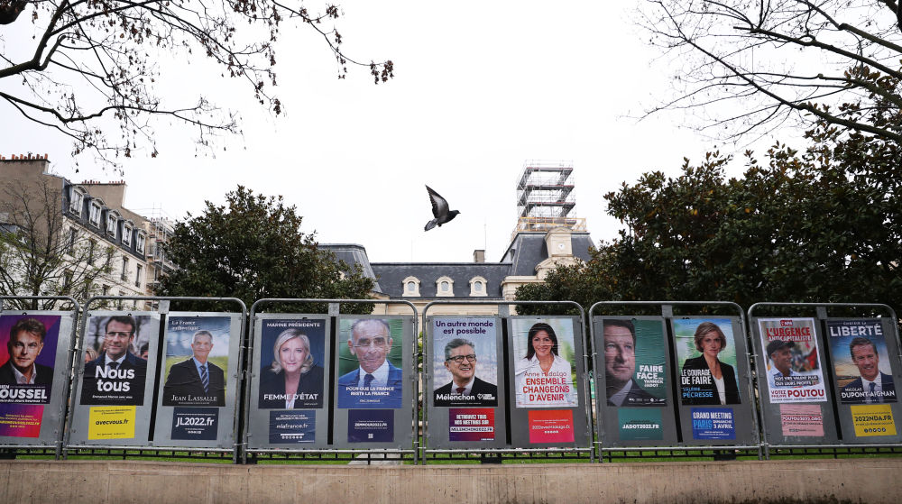 ↑2022年4月1日,在法國巴黎,一只鴿子飛過(guò)2022總統大選11名候選人(共12人)的競選海報。