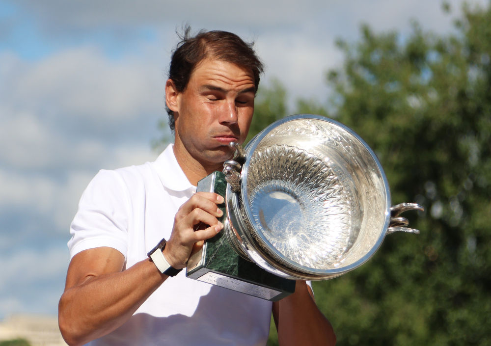 ↑2022年6月5日,2022法國網(wǎng)球公開(kāi)賽男子單打冠軍西班牙選手納達爾在頒獎儀式上手捧冠軍獎杯。