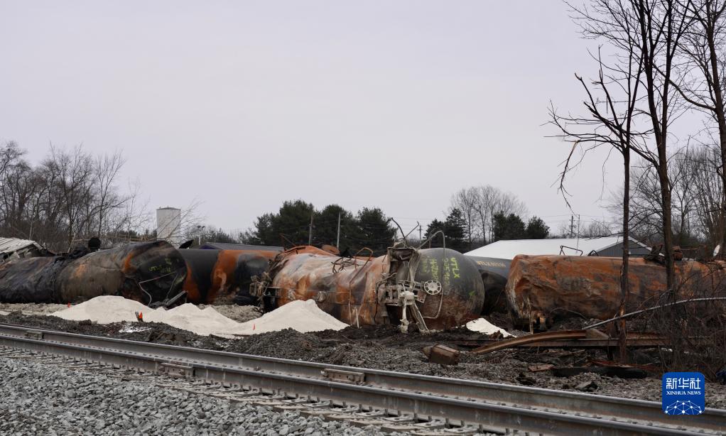 這是2月14日在美國俄亥俄州東巴勒斯坦鎮拍攝的脫軌列車(chē)殘骸。新華社發(fā)(章焱飛攝)