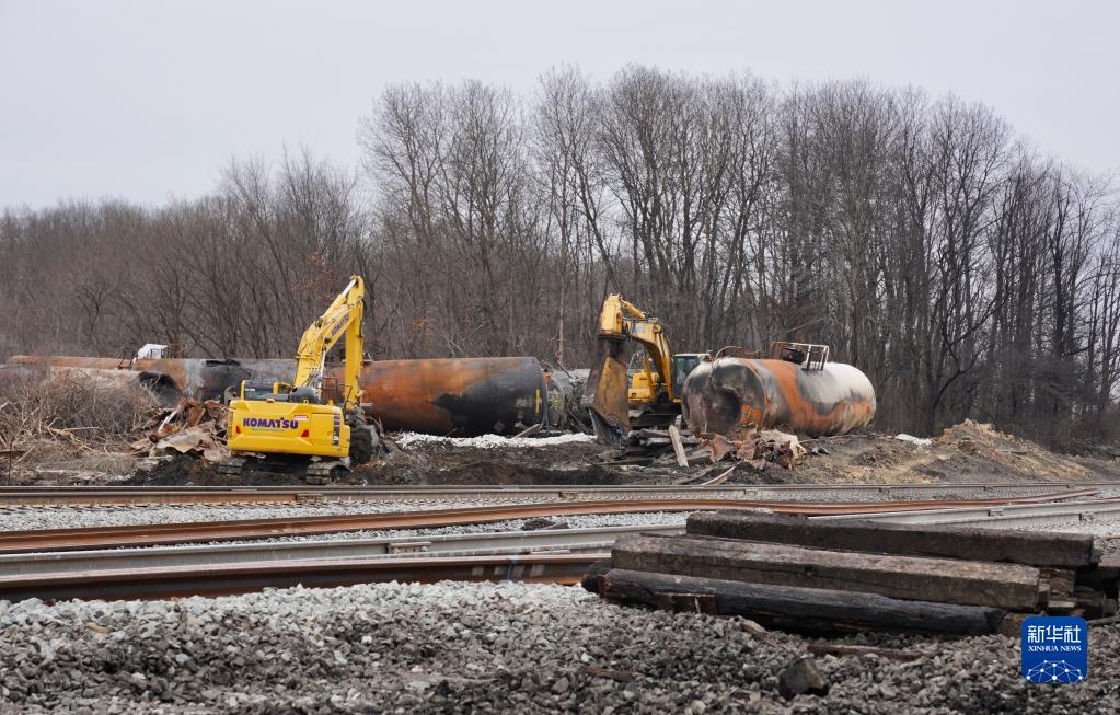 2月14日,在美國俄亥俄州東巴勒斯坦鎮,挖掘機在事故現場(chǎng)處理污染土壤。新華社發(fā)(章焱飛攝)