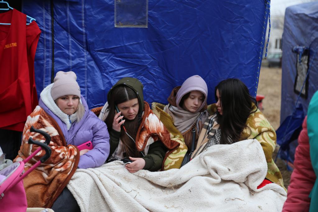 2022年2月27日,在羅馬尼亞北部與烏克蘭接壤的錫雷特邊境關(guān)口,烏克蘭女子在帳篷外打電話(huà)。(新華社記者 林惠芬 攝)