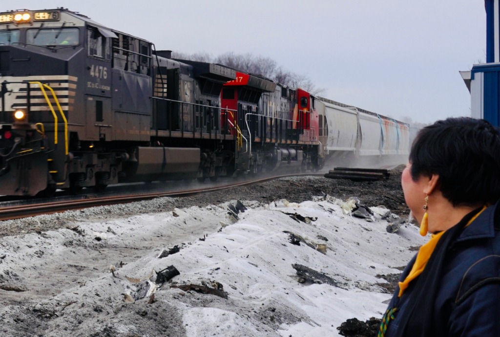2月14日,諾??四戏借F路公司貨運列車(chē)駛過(guò)美國俄亥俄州東巴勒斯坦鎮。新華社發(fā)(章焱飛攝)