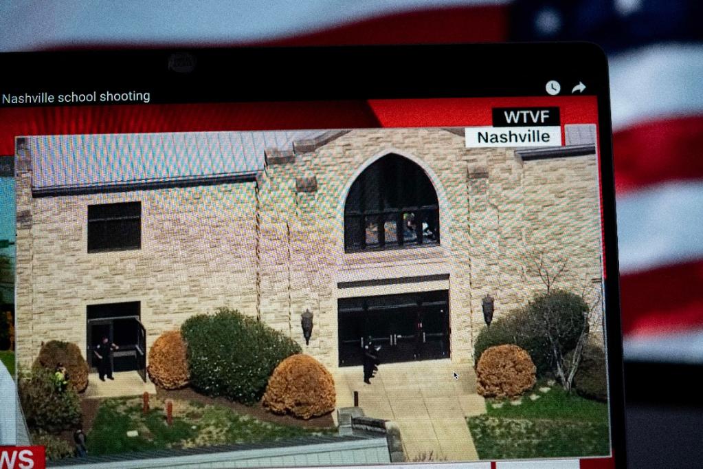 3月27日在美國阿靈頓拍攝的屏幕顯示美國田納西州一小學(xué)發(fā)生槍擊事件的現場(chǎng)畫(huà)面。田納西州納什維爾市一小學(xué)27日發(fā)生槍擊事件,造成包括3名兒童在內的6人遇害,槍手被警察擊斃。新華社記者劉杰攝