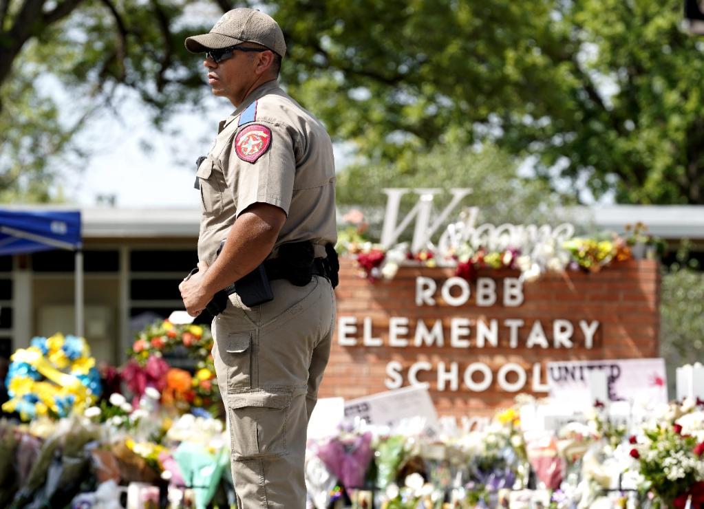 2022年5月27日,警察在美國得克薩斯州南部尤瓦爾迪市發(fā)生槍擊事件的小學(xué)外執勤。新華社記者吳曉凌攝