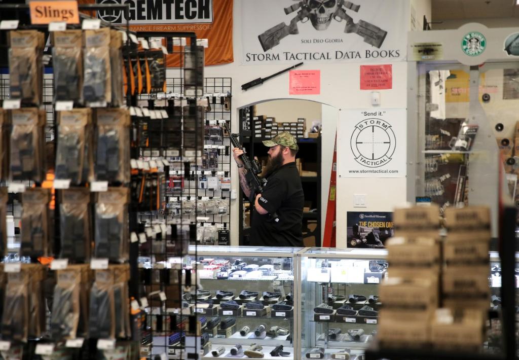 圖為2017年10月4日拍攝的照片,在美國拉斯維加斯的“新前線(xiàn)”槍械商店,一名店員為顧客展示槍支。新華社記者 王迎 攝