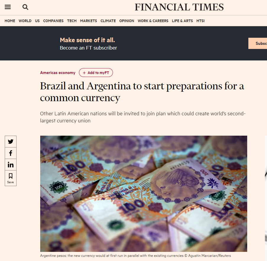 英國《金融時(shí)報》報道,今年1月,巴西與阿根廷宣布,兩國將就創(chuàng )建屬于拉美地區的共同貨幣進(jìn)行準備工作,并將邀請拉美地區其他國家加入,以促進(jìn)區域貿易、降低對美元的依賴(lài)。