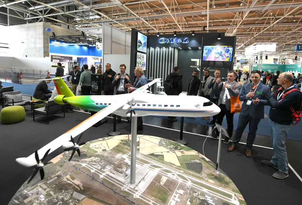 4月17日,人們在德國漢諾威工業(yè)博覽會(huì )上參觀(guān)一款氫能飛機模型。(新華社記者任鵬飛攝)