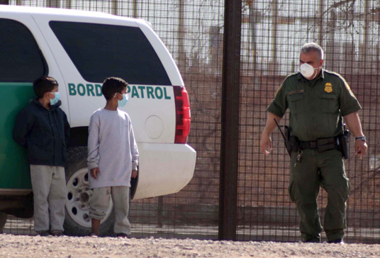 這張2021年3月27日在墨西哥華雷斯拍攝的照片顯示,兩名來(lái)自危地馬拉的移民兒童在跨越美墨邊境的里奧格蘭德河后,等待接受美國邊境巡邏隊人員的處理。新華社發(fā)(戴維·佩納多攝