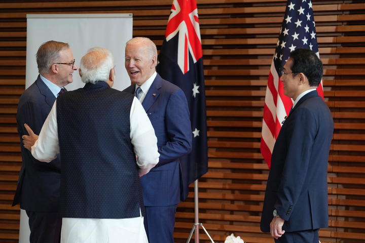 2022年5月24日,在日本東京,澳大利亞總理阿爾巴尼斯、印度總理莫迪、美國總統拜登和日本首相岸田文雄(從左到右)在美日印澳“四邊機制”峰會(huì )的歡迎儀式上交流。新華社記者張笑宇攝
