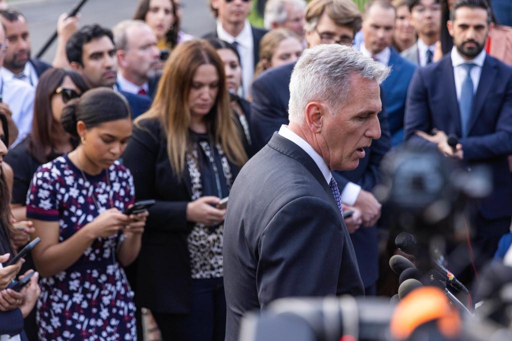 5月22日,在美國華盛頓白宮,國會(huì )眾議長(cháng)、共和黨人凱文·麥卡錫就債務(wù)上限問(wèn)題與美國總統拜登談判后回答記者提問(wèn)。(新華社發(fā),亞倫攝)