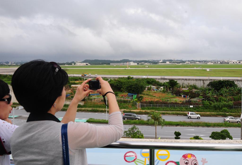 2010年5月18日,一名女子在日本沖繩縣嘉手納町的一個(gè)觀(guān)景臺遠觀(guān)美空軍駐沖繩嘉手納基地。新華社記者季春鵬攝