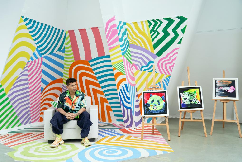 旅居成都的印度藝術(shù)家薩利與他的藝術(shù)作品合影。受訪(fǎng)者供圖