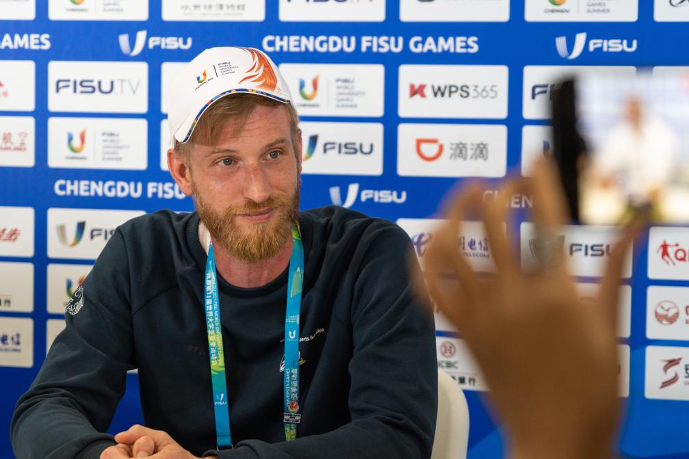 這是8月6日拍攝的萊茵-魯爾2025世界大學(xué)生夏季運動(dòng)會(huì )首席新聞宣傳官馬庫斯·柯尼希在接受媒體采訪(fǎng)。 新華社記者 龍泠宇 攝