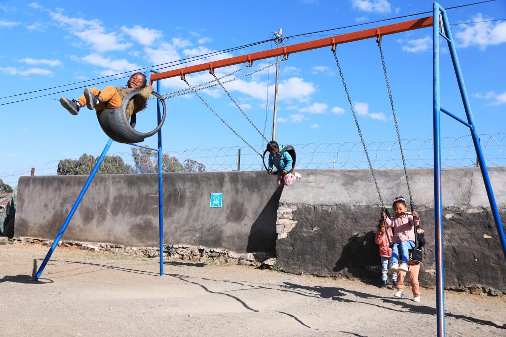8月11日,孩子們在南非德阿鎮的一家兒童早教中心蕩秋千。這家早教中心由中國龍源南非公司出資成立運營(yíng)。(新華社記者董江輝攝)