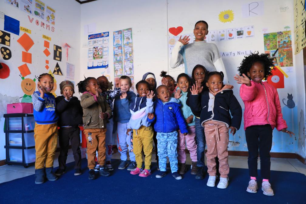 8月11日,老師與孩子們在南非德阿鎮的一家兒童早教中心合影。這家早教中心由中國龍源南非公司出資成立運營(yíng)。(新華社記者董江輝攝)