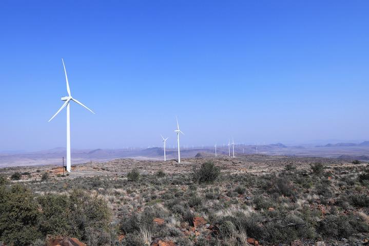 這是8月10日在南非北開(kāi)普省德阿鎮拍攝的中國國家能源集團龍源電力南非公司運營(yíng)的德阿風(fēng)電項目風(fēng)機。新華社記者 董江輝 攝
