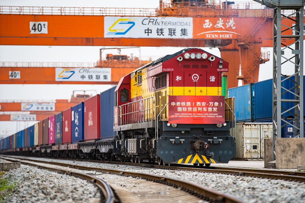 2022年4月22日,陜西西安首趟中老鐵路(西安至萬(wàn)象)國際貨運列車(chē)從西安國際港站發(fā)車(chē)。新華社記者 劉翔 攝