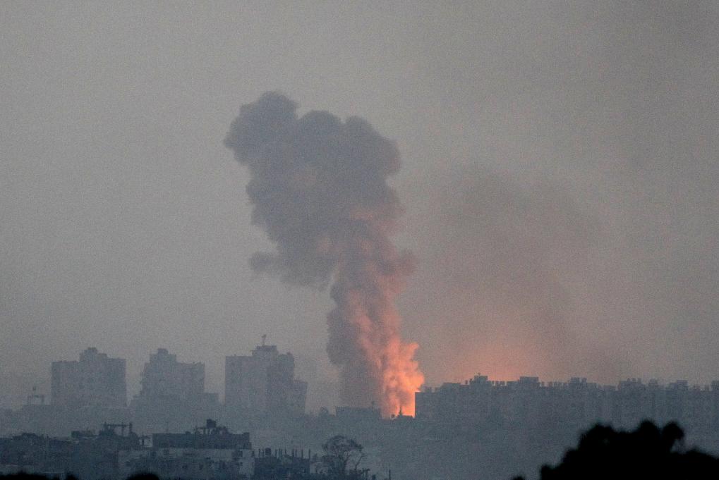 這張10月28日從加沙邊境以色列一側拍攝的照片顯示,加沙地帶北部遭以軍襲擊后升起濃煙。新華社發(fā)(伊蘭·阿薩亞格攝/基尼圖片社)