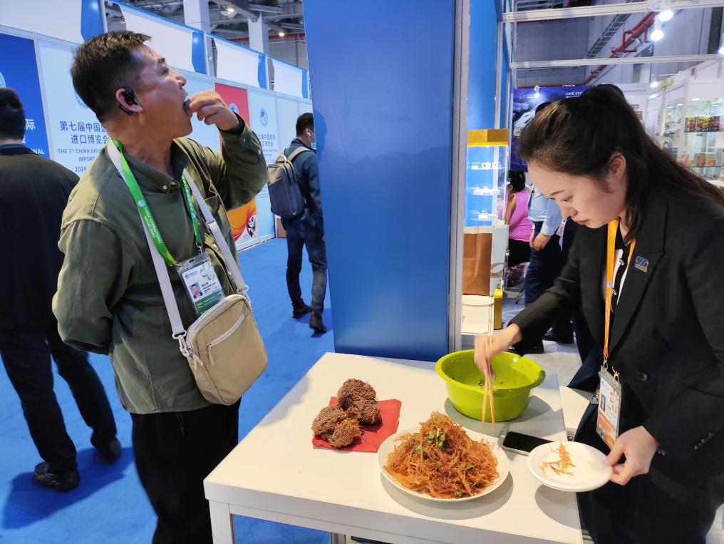 11月7日,第六屆進(jìn)博會(huì )東非商貿物流中心展臺前,觀(guān)眾品嘗麒麟菜。新華社記者 楊洋攝