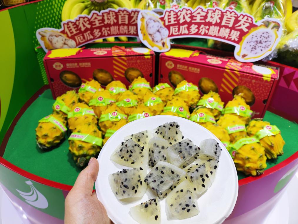 展館里,麒麟菜展臺不遠處,一顆顆黃澄澄的麒麟果,吸引了人們的目光。作為連續六屆參展進(jìn)博會(huì )的“老朋友”,佳農今年帶來(lái)了一款新品水果。11月6日,佳農通過(guò)進(jìn)博會(huì )宣布全球首發(fā)厄瓜多爾麒麟果。