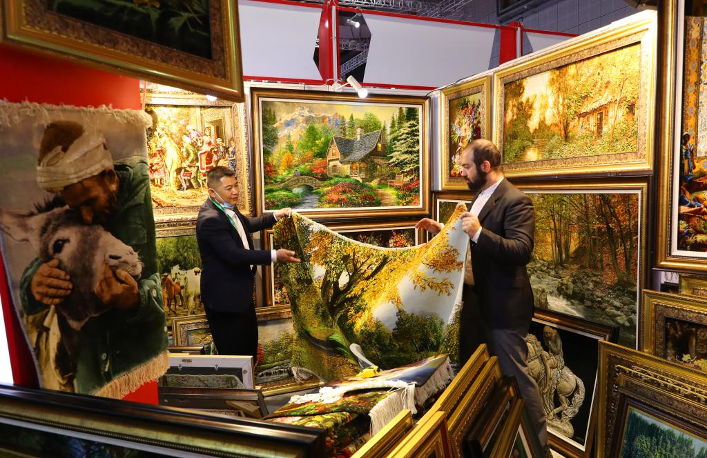 2023年11月10日,在第六屆進(jìn)博會(huì )上,一名參觀(guān)者在一家伊朗手工掛毯展位上查看一款風(fēng)景畫(huà)掛毯。新華社記者方喆攝
