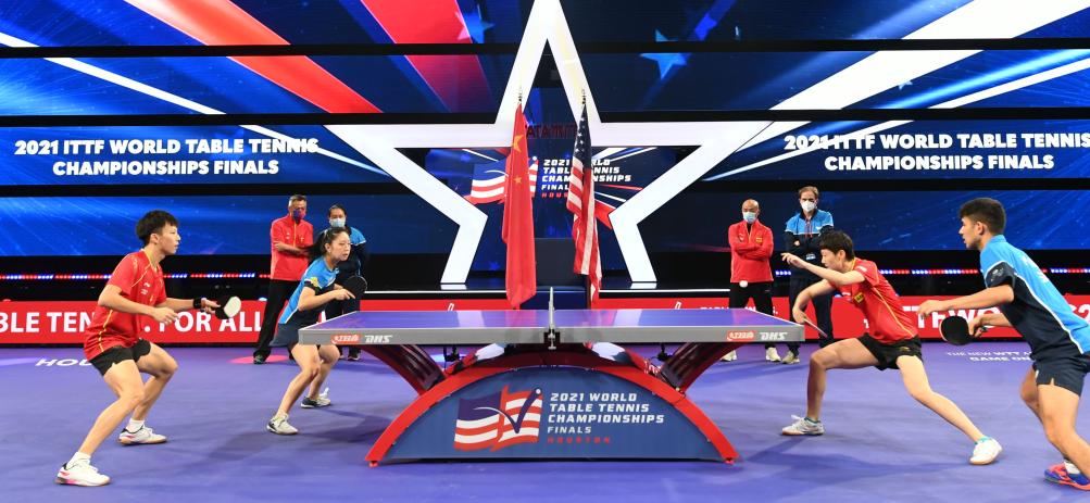 這是中美混雙組合在2021年11月下旬舉行的休斯敦世界乒乓球錦標賽期間合練。中美選手在休斯敦世乒賽上聯(lián)合組隊出戰混合雙打比賽,紀念中美“乒乓外交”50周年。新華社記者 吳曉凌 攝