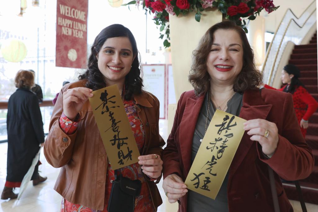 2023年2月5日,在美國舊金山戴維斯音樂(lè )廳,兩名欣賞中國農歷新年音樂(lè )會(huì )的觀(guān)眾展示福帖。新華社發(fā)(劉藝霖攝)