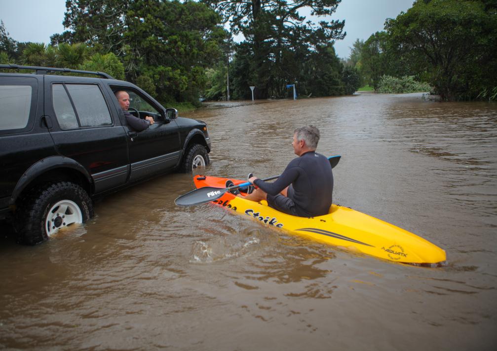 圖為2023年2月14日,在新西蘭奧克蘭,一名男子在積水路段劃船出行。新華社發(fā)(趙綱 攝)